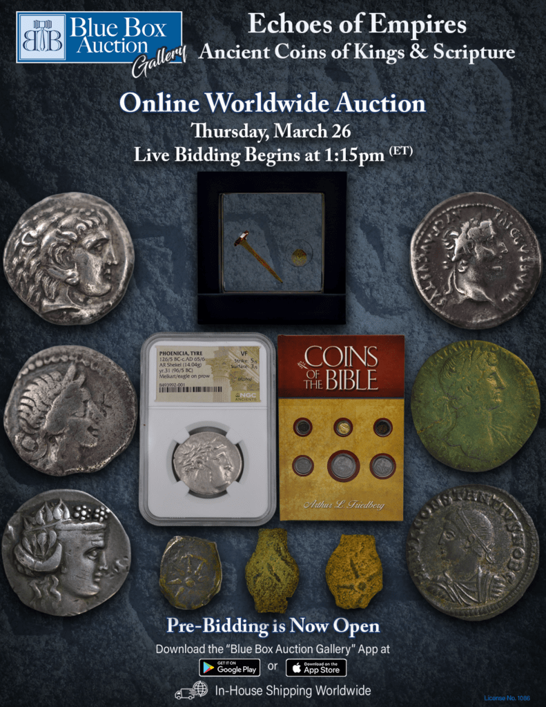 Interspersed throughout the auction are two recurring supplementary lots. The book Coins of the Bible by Arthur L. Friedberg, published by Whitman Publishing, is a 110-page reference covering Biblical coinage from the Widow’s Mite to the thirty pieces of silver, offered at an accessible starting bid. Widow’s Mite and Roman Nail sets are also available, each pairing a genuine prutah with a hand-forged Roman iron nail from the Inchtuthil legionary fortress hoard, accompanied by a certificate of authenticity.